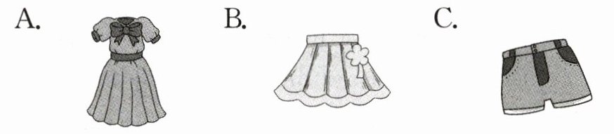 A. A pink dress. B. A blue skirt. C. Black trousers.