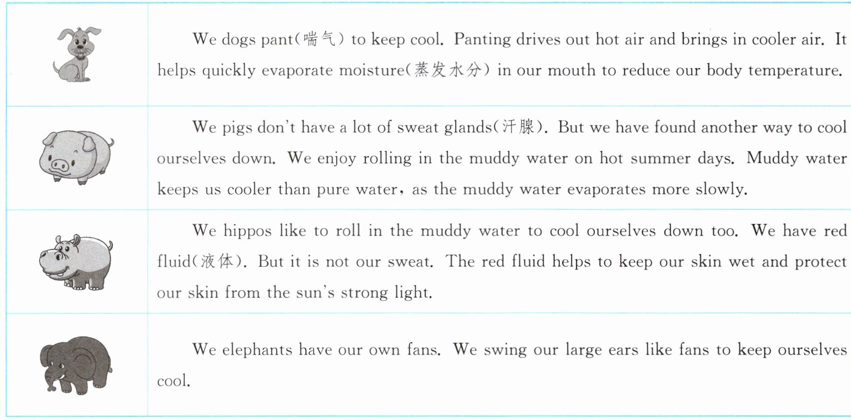 We pigs don't have a lot of sweat glands(汗腺). But we have found another way to cool ourselves down. We enjoy rolling in the muddy water on hot summer days. Muddy water keeps us cooler than pure water, as the muddy water evaporates more slowly.
