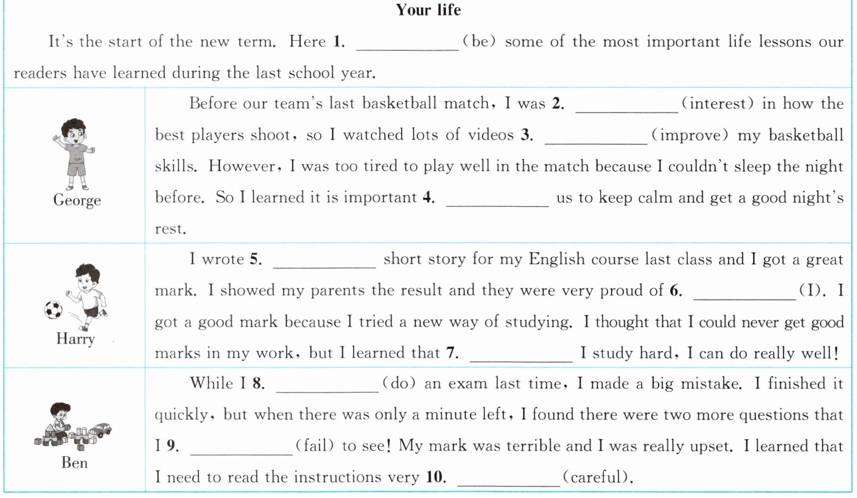 (improve) my basketball skills. However, I was too tired to play well in the match because I couldn't sleep the night before. So I learned it is important 4. ______for