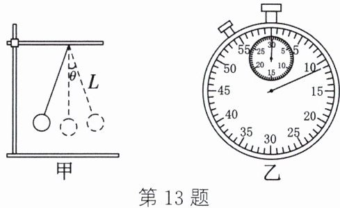 13. 如图甲所示,某同学模仿伽利略研究单摆的运动规律,他用同一小球,保持摆幅相同,只改变摆绳长度,做了三次实验,如表是这名同学三次实验的测量结果。