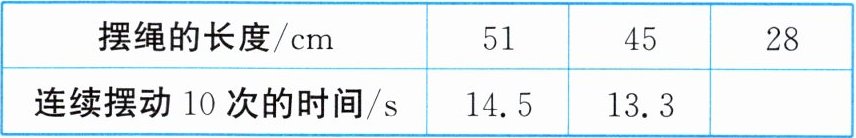 (1)摆绳长度为28 cm时,连续摆动10次的时间如图乙所示,请将时间填入表中空格。