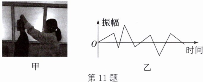 11.(2024·无锡江阴期中)如图甲所示,将敲响的音叉在耳边慢慢转动,会听到时强时弱的声音。音叉的两个叉股就是两个声源,都会发出疏密相间的声波。两个声源发出的疏密相间的波传播到一点,会相互影响。根据这一原理,科学家开发出一种“以声消声”的反噪声技术。简单地说,就是用话筒将噪声收集起来传送到专门的电脑进行分析,根据分析结果通过喇叭发出相应的噪声,恰能将原来噪声的振动抵消,这种“以声消声”的方法称作“有源消声技术”。目前这一技术已经应用到空调器、大功率冰箱及汽车发动机的制造中。