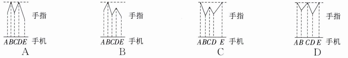 (4)超声指纹识别系统在发出超声波遇到手指上 A、B、C、D、E 五个位置,测得回收信号的时间分别为 0.30 ms、0.16 ms、0.30 ms、0.14 ms、0.30 ms。根据时间,求出手指与手机平面的距离,就可以绘出指纹的大致形状,则该处指纹的大致形状是