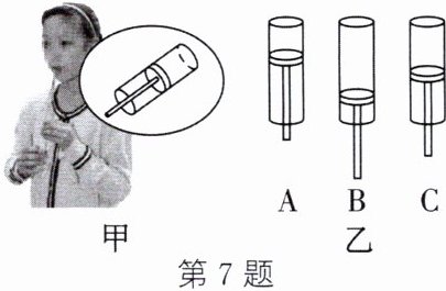7. 小漫自己制作了一个哨子,在筷子上缠一些棉花,做成一个活塞,用水蘸湿棉花后插入两端开口的塑料管中,如图甲所示,用嘴吹管的上端可以发出哨音。