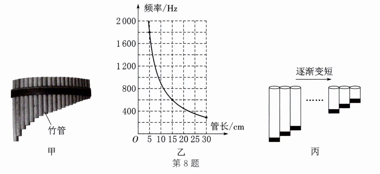 8. (2024·常州金坛期中)学校开展自制排箫“跨学科实践”活动。如图甲所示,排箫是由若干长短不一的竹管组成的。演奏时,用嘴对着竹管吹气,便能发出声音,声音的频率与管长的关系如图乙所示,音级、音区与频率的关系如表1所示。如图丙所示,小组同学选择若干根长为20 cm的相同吸管,用剪刀剪裁后,按由长到短的顺序横向连接制得“排箫”。