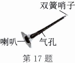 17. 图示为我国民族吹奏乐器——唢呐,用它吹奏名曲《百鸟朝凤》时,模仿的多种鸟儿叫声悦耳动听,让人仿佛置身于百鸟争鸣的森林之中。关于唢呐,下列说法正确的是(