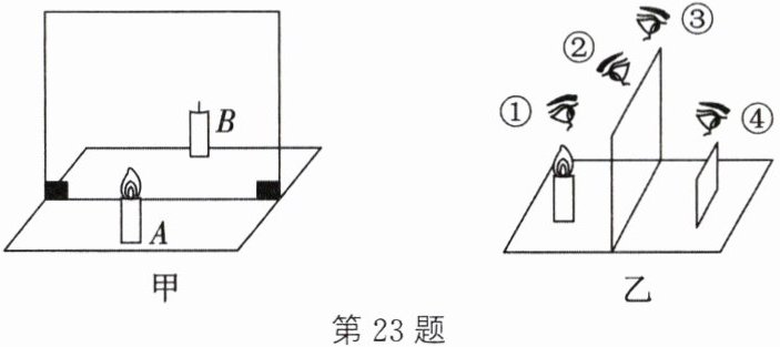 ,目的是 便于确定像的位置。(2)图甲中选择两个完全相同的蜡烛A和B的目的是 比较像与物的大小关系。
