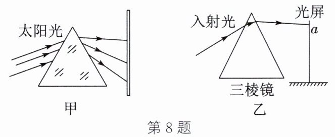 8. 如图甲所示是一束太阳光照射到三棱镜后出现的情况。好奇的小明将太阳光改成红光仍然沿原来的方向照射到三棱镜上(如图乙),在光屏上a点处形成一个红色光斑。现保持入射光位置、方向及三棱镜位置不变,仅将红光改为紫光,以下说法正确的是(