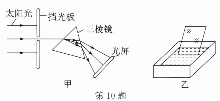 10. (2024·南通海安期中)如图甲所示,让一束太阳光通过挡光板的狭缝照射到三棱镜的一个侧面上,用光屏接收从三棱镜的另一侧出射的光线。