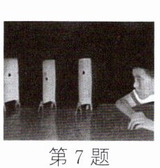 7. (2024·宿迁段考)如图,小明想通过三张纸片上的小孔看见烛焰,他应该将烛焰、三个小孔和人眼调到