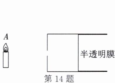 14. (跨学科实践·日常生活)如图所示,小兰用易拉罐制成了一个针孔照相机。将点燃的蜡烛置于小孔前的适当位置,观察并研究小孔成像的特点。