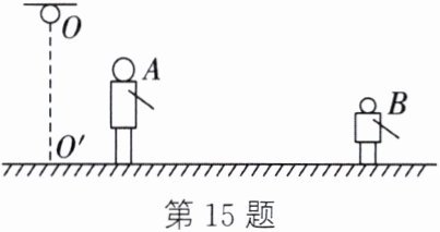 15. 有两个高矮不同的小朋友A和B,A比B高,夜晚,他们分别站在路灯下,路灯O是光源,O'点是路灯在地面上的投影:A、B两人和O'点在同一直线上,如图所示,他们的头部分别在地面上留下两个影子A'和B'(未画出),相距d'。当两人沿过O'点的直线,以相同的速度向右行进时,我们可以观察到地面上A'和B'之间的距离将(