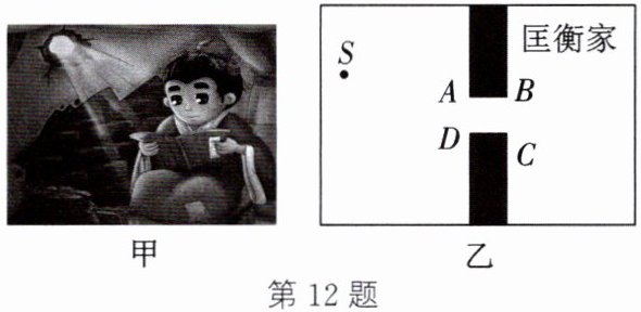 12. 成语"凿壁偷光"是指匡衡凿穿墙壁引邻家之烛光读书一事(如图甲)。其原理可简化成如图乙所示的模型,S为邻家烛焰,ABCD是匡衡在厚墙壁上凿穿的孔洞,请作出邻家烛焰S在匡衡家照亮的范围(用阴影线表示),完成相应光路图。