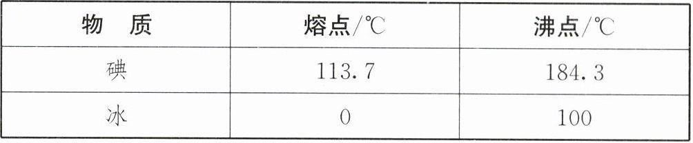 (2)小明猜想碘是先由固态迅速变为液态,再由液态迅速变为气态,因为变化的速度太快,液态碘出现的时间太短,因而没有观察到。请你根据如表提供的信息分析,小明的猜想是