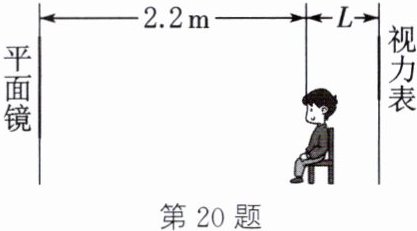 20.(2024·宿迁沭阳期中)检查视力的时候,视力表往往放在被测者头部的后上方,被测者识别对面墙上镜子里的像,要求被测者与视力表像的距离是5 m。如图是小明同学在一次测量视力时的情景,关于这次视力测量的说法正确的是 (