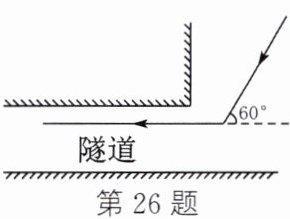 26. 如图所示,小明利用一块平面镜使此时的太阳光水平射入隧道内,请你通过作图画出平面镜并标出反射角的度数。