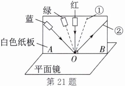 21. 如图所示,小海同学在探究“光的反射规律”时,利用红、绿、蓝三种色光的激光笔进行实验,他将位于同一平面内的白色纸板A、B立在平面镜上。下列说法中正确的是 (