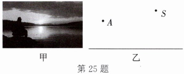25.(2024·扬州邗江校级一模)如图甲所示,夕阳下钓鱼爱好者正在垂钓,阳光经水面反射后进到垂钓者眼中,形成了唯美画面。如图乙中点S代表太阳,A代表钓鱼爱好者的眼睛,请你画出太阳发出的光经水面反射进钓鱼爱好者眼中的光路图,并保留作图痕迹。