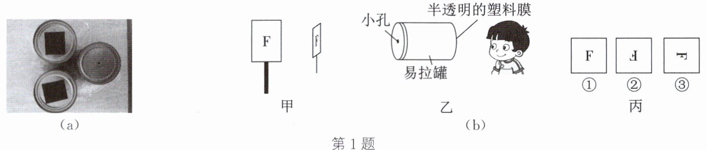 (2)小明从实验室借来用发光二极管制成的“F”字样光源,如图(b)甲所示,将“F”字样光源、简易针孔照相机按图(b)乙所示位置放好,小明观察到塑料膜上所成的像是图(b)丙中的