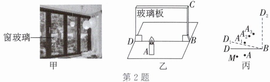 2.(2024·泰州海陵一模)周日,小明将如图甲所示的玻璃窗向外推的过程中,观察到室内物体在玻璃中所成像的位置也随着发生变化。于是他利用两支大小完全相同的蜡烛A和A'、茶色透明薄玻璃板、白纸、刻度尺等器材,进行了以下探究。