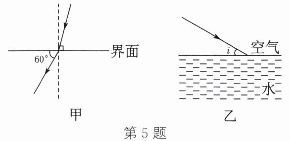 5. 一束光从玻璃斜射入空气中,如图甲所示,则折射角大小为