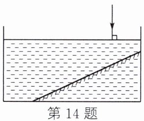 14. 将一平面镜斜放在装有水的水槽中,一束光垂直射向水面,如图所示。请画出这束光在水中行进最后射出水面的大致光路图。