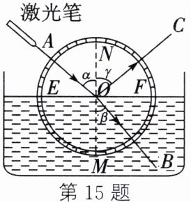 15. 小强同学利用如图所示的实验装置探究“光的反射和折射规律”。在玻璃水槽中竖直放置的光屏是由E和F两个半圆形光屏组成的,NOM为两半圆的分界线,其中光屏F可绕直径NOM前后折转。实验测量数据如表所示。