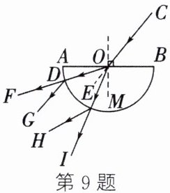 9. 如图所示为光沿CO射向半圆形玻璃砖的圆心O,分别透过平直界面AOB和圆弧形界面AMB时的光路。在玻璃中的光线为