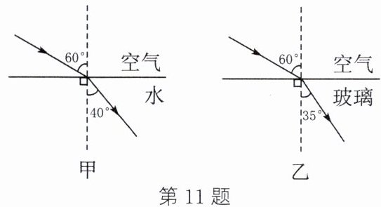 11. 小明在探究“光的折射规律”时,做了两个实验,如图所示。对比两图,你的发现是