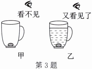 3.(教材P64材料改编)陶瓷茶杯底部放有一枚硬币,人移动到某一位置时看不见硬币(如图甲),往茶杯中倒入一些水后,又能够看见硬币了(如图乙)。下列有关说法错误的是(