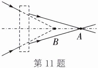 11. 如图所示,一束光经过一个透镜后会聚于主光轴上的点A,取掉透镜后,光会聚于点B,则该透镜起到