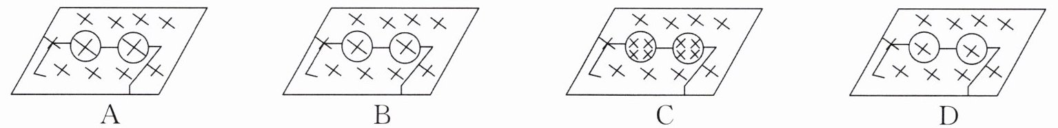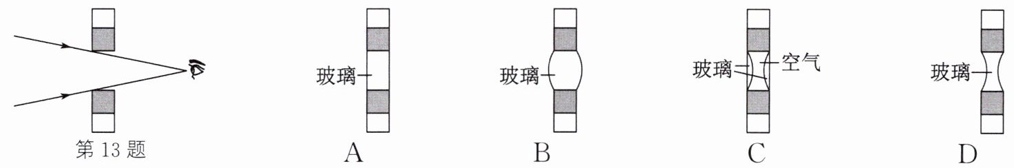 13. (2024·扬州仪征期中)在一个不透明的木板上,钻一个小孔。用眼睛通过小孔可以观察到一定的范围。如图所示。为了扩大观察的范围,在小孔中嵌入各种形状的玻璃制品。在下列四个截面中能获得最大观察范围的是(