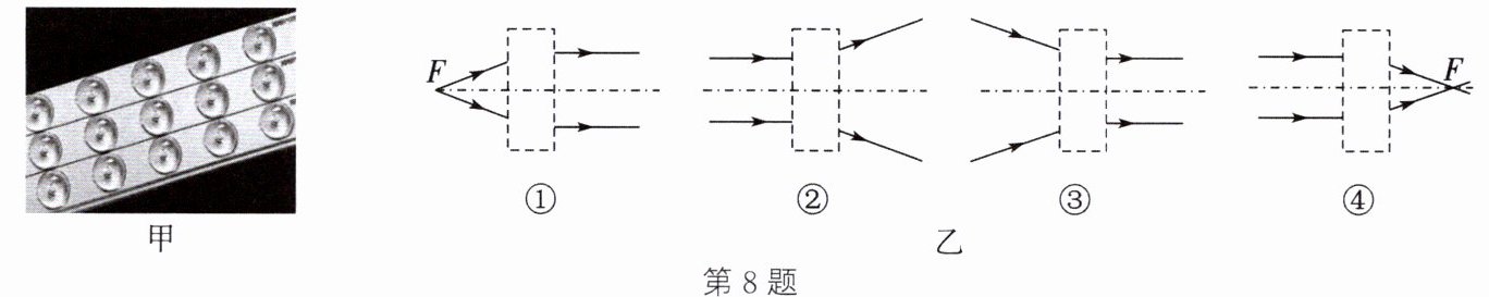 8. (新情境·科技民生)如图甲所示,小莉在老师指导下,观察教室里的LED日光灯,发现每个LED发光芯片上都封装了硅胶透镜。资料显示,芯片最大发光角度是180°(大于180°范围也有少量余光),光线通过透镜会聚可得到180°、160°、140°、120°、90°、60°等不同的出光角度。图乙中的光路显示了一些透镜对光线的作用,与LED透镜对光线的作用相同的是(