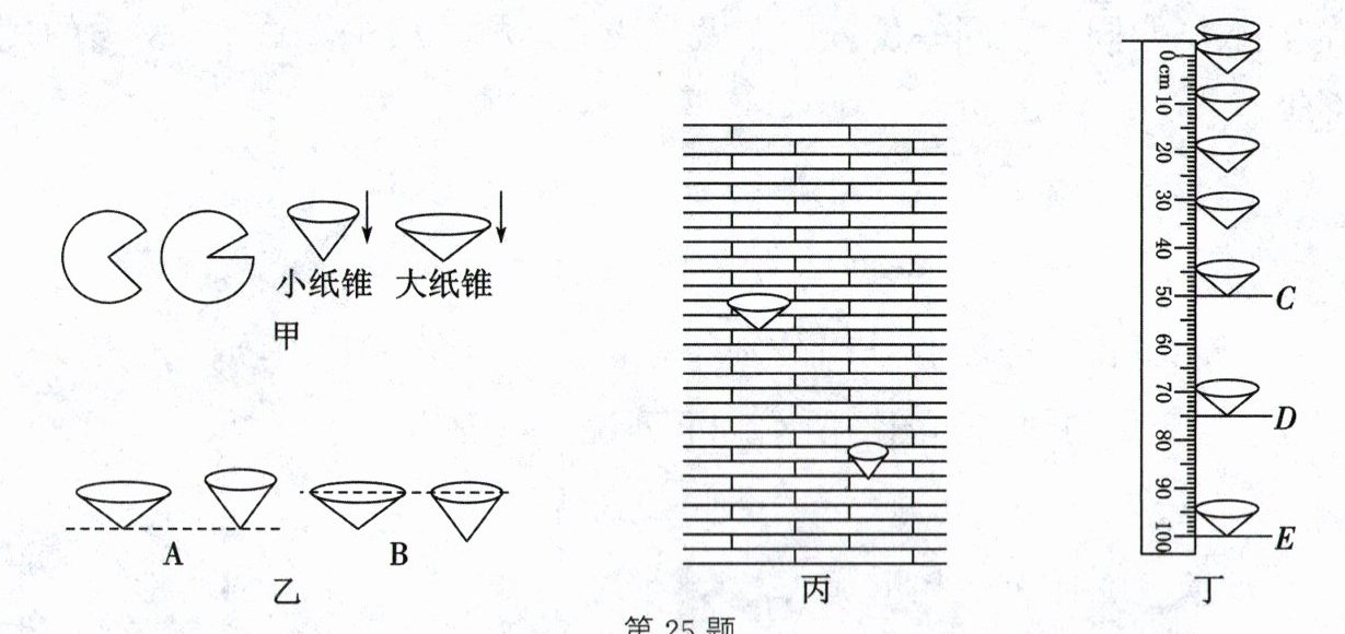 25. (8分)小明取两张等大的圆形纸,将它们做成图甲所示的两个锥角不等的纸锥,用它们来比较“两个纸锥下落快慢”。