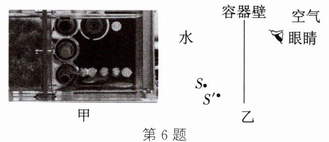 6. (2024·菏泽)2024年4月26日,神舟十八号载人飞船成功对接中国空间站,装有4条斑马鱼的特制透明容器顺利转移到问天实验舱,如图甲所示。请你在图乙中画出航天员看到斑马鱼的光路图(S表示斑马鱼的实际位置,S'表示航天员看到的斑马鱼像的位置,不考虑容器壁对光线的影响)。