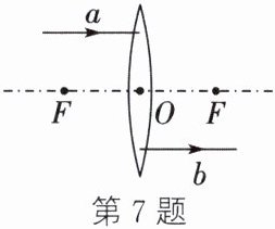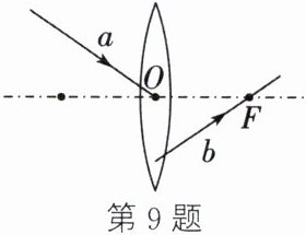 9. 如图所示,F是凸透镜焦点,请画出光线a、b对应的折射光线和入射光线。