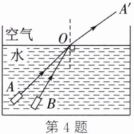 4. (2024·河南)如图,观光水池中,一束红光沿AO方向从水中射入空气,折射光线为OA'。若另一束红光沿BO方向从水中射入空气,请大致画出入射光线BO的折射光线,并标出对应的折射角r。