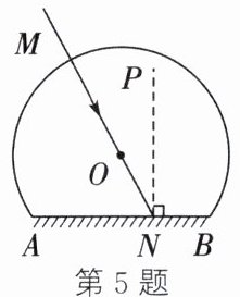 5. 一个底面镀银的球冠状形玻璃球放置在水平桌面上,其横截面如图所示。一条光线从玻璃球冠上表面的M点通过球心O射到球冠的底面N点。虚线PN为底面AB的法线。画出该光线经底面AB反射后从弧形一侧射出的光路图(不考虑二次反射)。