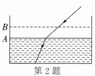 2. 如图是一束光斜射入盛有水的容器中的光路图,保持光束和容器的位置不变,向容器中逐渐加水,水面由A升到B,请画出此时的折射光线。