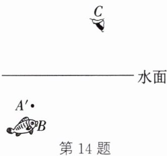 14. 平静水面的上方有一只小鸟,水中有条小鱼,水面一侧C点的人眼恰好看到它们在水中的像重合。以A'点代表小鸟的像,以小鱼眼睛B点代表小鱼的实际位置。请画出小鸟在水面上方的实际位置A(用实心点表示)以及人眼看到小鱼的光路图。