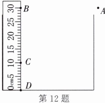 12. (2023·潍坊)为测量容器中水的深度,一同学将刻度尺竖直插入水中,如图所示。从A处向水中看去,看到刻度尺上B点在水中所成的像位于C点,同时看到水中D点的像也位于C点。请据此:(1)用实线画出水面位置。(2)完成看到D点的光路图。