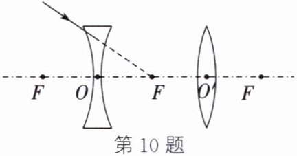 10. 如图所示,薄凸透镜与薄凹透镜恰好共用同一个主光轴和同一个焦点F,一条入射光线射向薄凹透镜的右侧焦点F。请在图中作出这条入射光线经过薄凹透镜和薄凸透镜折射的光路图。