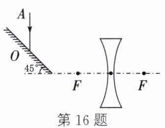 16. 如图所示,凹透镜的主光轴处于水平位置,F是其焦点,平面镜与水平方向成45°,请画出竖直激光束AO经平面镜反射,再经凹透镜折射的光路图。