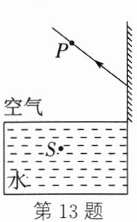 13. (2024·潍坊)如图所示,水槽内装满水,槽内有一点光源S,紧贴右侧槽壁竖直固定一平面镜。S发出的一条光线经水面折射,又经平面镜反射后过P点。