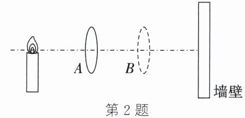 2. 小明在房间里进行“探究凸透镜成像特点的实验”情景如图所示。保持蜡烛的位置不变,只移动透镜,小明发现透镜在A、B两处时,墙壁上都能得到清晰的像,则两次所成的像 (