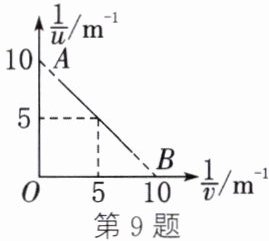 9. 如图,线段AB为一凸透镜成像的物距倒数和像距倒数的对应关系。下列推测正确的是 (