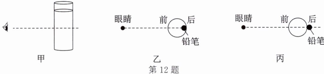 12.(2023·扬州)如图甲,在装有水的杯子里,小红将一支铅笔分别紧贴杯壁内、外竖直放置,两次都观察到铅笔放大的像,俯视图如图乙、丙所示。下列说法正确的是 (