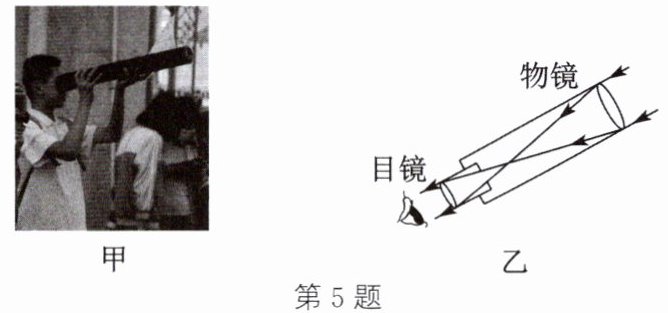 5. 如图甲所示是天文爱好者通过纯手工打磨镜片自制的望远镜,该望远镜不仅可以看到8亿公里外的木星,甚至能清晰地看到木星表面的斑纹,图乙是该望远镜内部结构及光路示意图。下列关于该自制望远镜的说法正确的是(