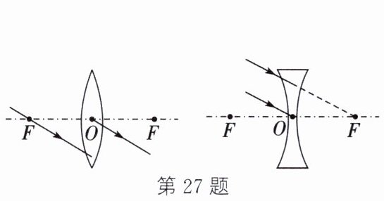 27. 如图,根据给出的入射光线或折射光线,画出相应的折射光线或入射光线。