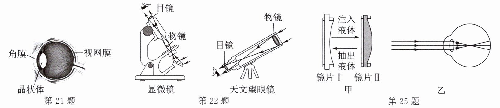 25. (2024·盐城一模)如图甲是一种新型的眼镜片,可通过在透明薄膜中注入或抽出光学液体来实现不同的作用,镜片Ⅱ对光线有